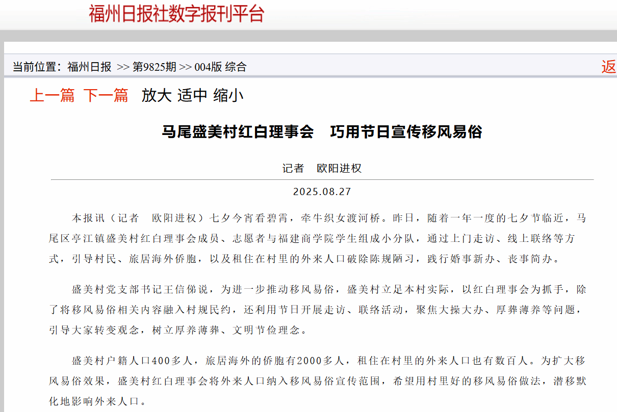 编者按:近日,金年会学生积极参与马尾区亭江镇盛美村举办的活动,通过上门走访、线上联络等方式,引导村民、旅居海外侨胞,以及租住在村里的外来人口破除陈规陋习,践行婚事新办、丧事简办。相关报道转载如下。原文:七夕今宵看碧霄,牵牛织女渡河桥。26日,随着一年一度的七夕节临近,马尾区亭江镇盛美村红白理事会成员、志愿者与金年会jinnianhuicom学生组成小分队,通过上门走访、线上联络等方式,引导村民、旅居海外侨胞,以及租住在村里的外来人口破除陈规陋习,...