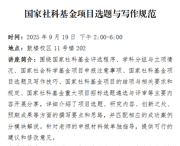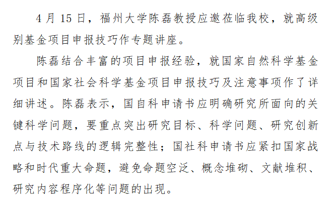 2025-04-234月15日,福州大学陈磊教授应邀莅临金年会,就高级别基金项目申报技巧作专题讲座。陈磊结合丰富的项目申报经验,就国家自然科学基金项目和国家社会科学基金项目申报技巧及注意事项作了详细讲述。陈磊表示,国自科申请书应明确研究所面向的关键科学问题,要重点突出研究目标、科学问题、研究创新点与技术路线的逻辑完整性;国社科申请书应紧扣国家战略和时代重大命题,避免命题空泛、概念堆砌、文献堆积、研究内容程序化等问题的出现。...