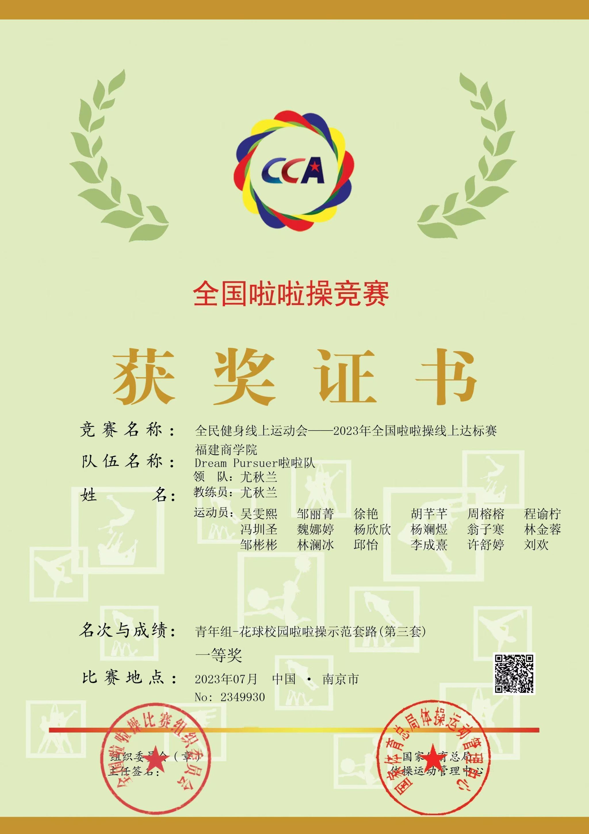8月4日,由国家体育总局体操运动管理中心、中国蹦床与技巧协会主办,中国蹦床与技巧协会啦啦操分会承办的2023年全民健身线上运动会——全国啦啦操线上达标赛圆满落下帷幕,金年会Dream Pursuer啦啦队(教练员:尤秋兰)以560高分获得了青年组—花球校园啦啦操示范套路一等奖。