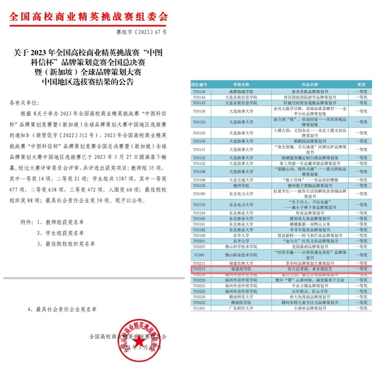 近日,2023年全国高校商业精英挑战赛“中国科信杯”品牌策划竞赛全国总决赛在线上举办,金年会首次组织学生参加该项赛事,共有4支队伍入围总决赛。其中,国际经贸学院“茉莉小队”(由严亭宏、吴俊怡、王雯婷、张婷婷、吴兴桦组成,指导老师:卢美琴、林明)的作品“传古法茉莉,承非遗技艺”获得全国总决赛一等奖。