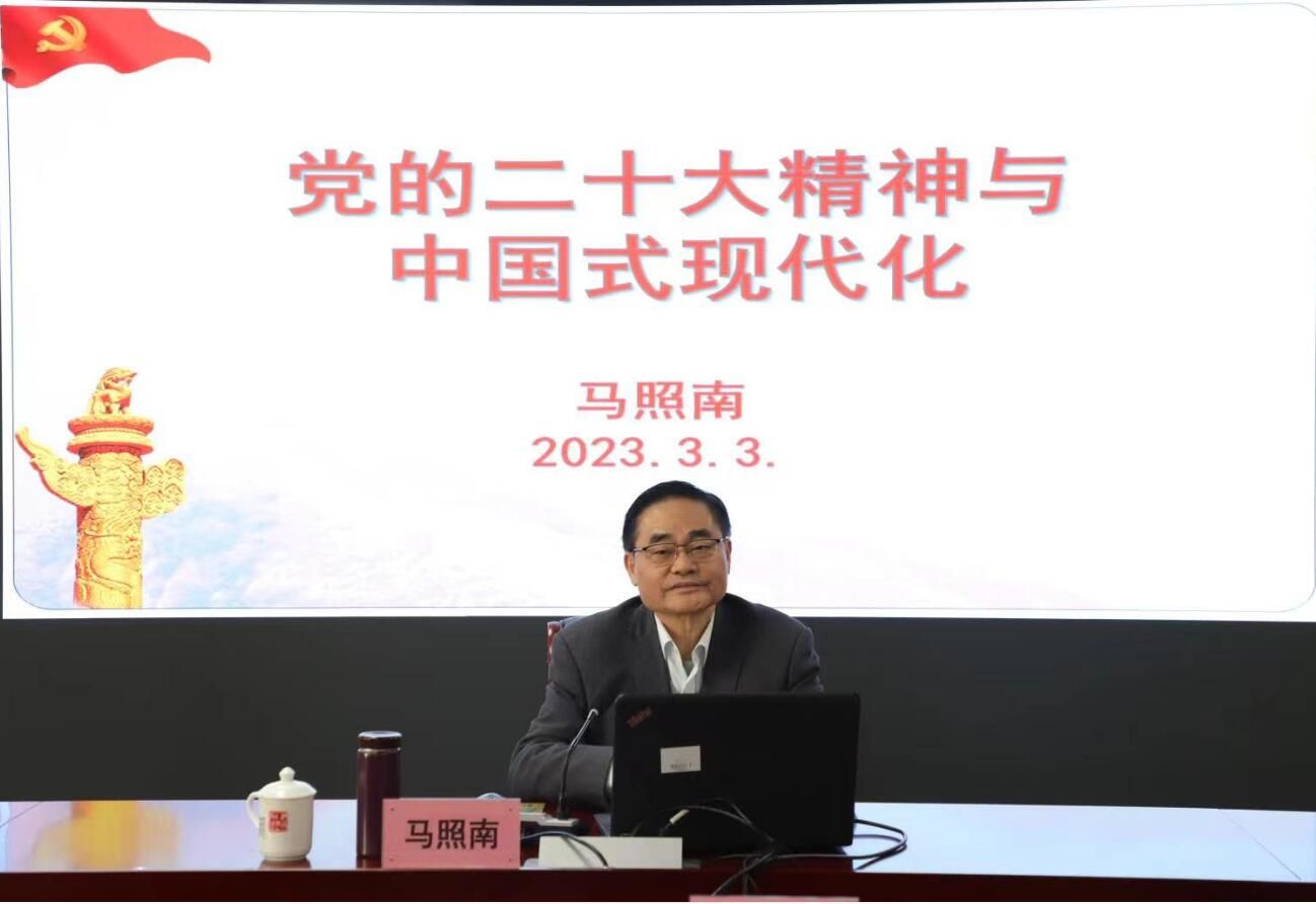 马照南教授以今年2月习近平总书记在新进中央委员会的委员、候补委员和省部级主要领导干部学习贯彻习近平新时代中国特色社会主义思想和党的二十大精神研讨班上发表重要讲话强调要正确理解和大力推进中国式现代化为切入点,分析了学习贯彻党的二十大精神的时代背景,深刻阐述了党的二十大精神和中国式现代化的8个核心要义,指出要深刻领会贯彻党的二十大精神,必须坚持全面准确、深入理解精神实质,必须牢记习近平总书记提出的“在全面学习上下功夫、在全面把握上下功夫,在全面落实上下功夫”的明确要求,做到“五个牢牢把握”,坚定信心,勇毅前行,夺取中国式现代化的新胜利。
