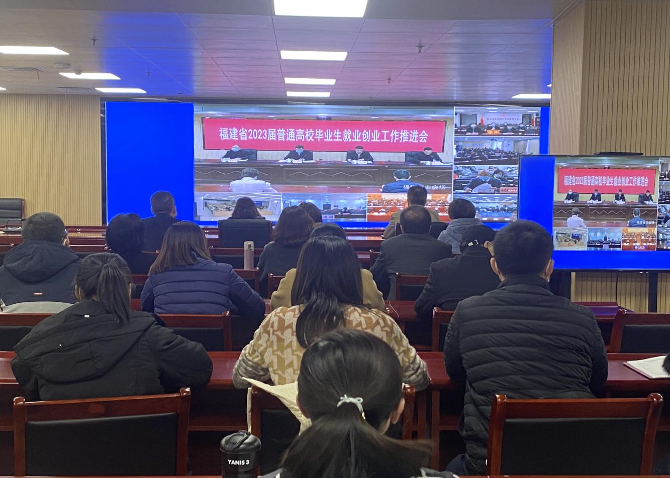 金年会在连江校区图书馆五楼第一会议室设立分会场,校领导刘剑津、徐晓丹、杨晓翔及校就业创业工作领导小组成员,二级学院党政负责人、二级学院党委副书记、就业指导中心工作人员和全体2023届毕业班辅导员收看了视频会。