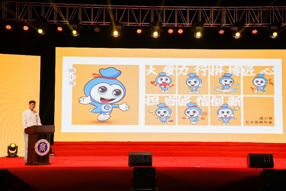 迎新晚会分为“社彩飞扬青春心向党”“怀抱梦想奋进新征程”“扬帆前行建功新时代”三个篇章。福商卡通形象“福小商”精彩亮相。“福小商”秉承着“明德、诚信、允能、笃行”校训精神,展示了“大爱、诚信、力行、担当、匠心、拼搏、创新”的福商学子形象。