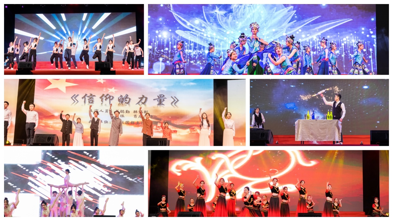 晚会中歌舞、相声、朗诵、短剧、武术、体操、花式调酒表演等精彩的节目为观众呈现了丰盛的视听盛宴。《双语游福商》带领大家欣赏校园美丽景色,感受校园文化内涵;民族舞《苗女银秀》风韵优美,提升了铸牢中华民族共同体意识;朗诵《信仰的力量》振奋人心、催人奋进;歌曲《有我》展现了中国青年接过先辈手中的接力棒,自觉肩负起民族复兴大任的决心。