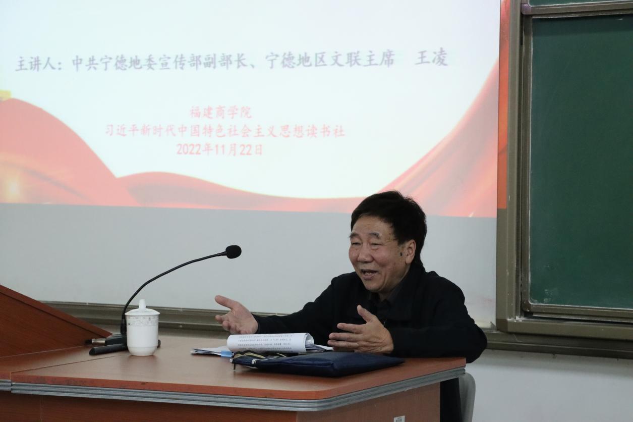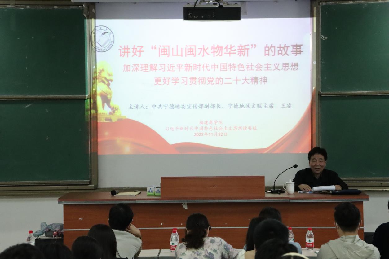 闽山闽水物华新,“习言习语”催人进。11月22日晚,中共宁德地委宣传部原副部长、原宁德地区文联主席王凌研究员受邀莅临金年会,为金年会师生作了题为《讲好“闽山闽水物华新”的故事,加深理解习近平新时代中国特色社会主义思想,更好学习贯彻党的二十大精神》的专题讲座。校党委副书记吴访益,马克思主义学院、机关党委负责同志,学校习近平新时代中国特色社会主义思想学生读书社、教职工读书社社员代表参加。