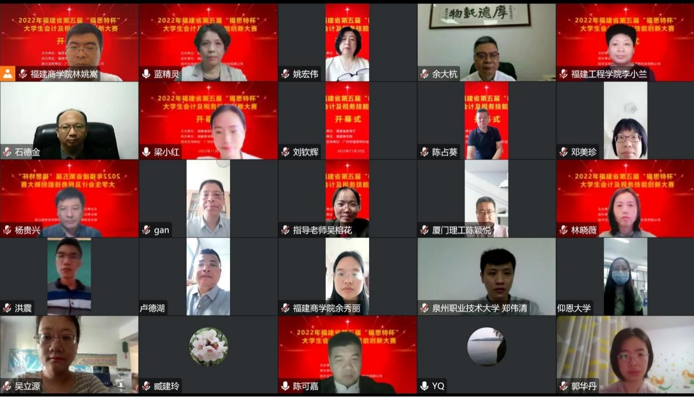 11月20日上午,由福建省教育厅主办,金年会承办,广州市福思特科技有限公司提供技术支持的福建省第五届“福思特杯”大学生会计及税务技能创新大赛于线上成功举办。大赛组委会成员、技术支持企业负责人以及来自全省30多所高校的经管类学科专业负责人参加了开幕式,校长程灵在开幕式上致辞。全省27所本科高校94支代表队和9所高职院校22支代表队,近400名学生参赛。