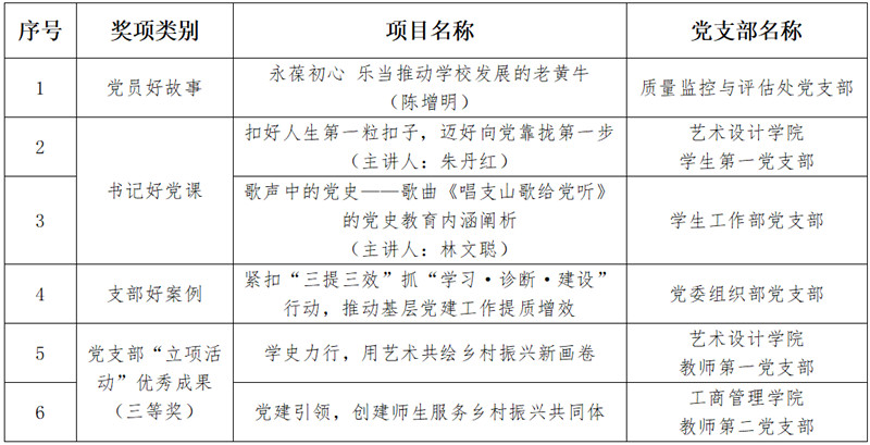 据悉,本次全省高校党支部工作“立项活动”优秀成果和“三个好”评选活动共评选出厦门大学等本科院校党支部工作“立项活动”优秀成果一、二、三等奖共80项和厦门大学等本科院校“党员好故事、书记好党课、支部好案例”各20项。