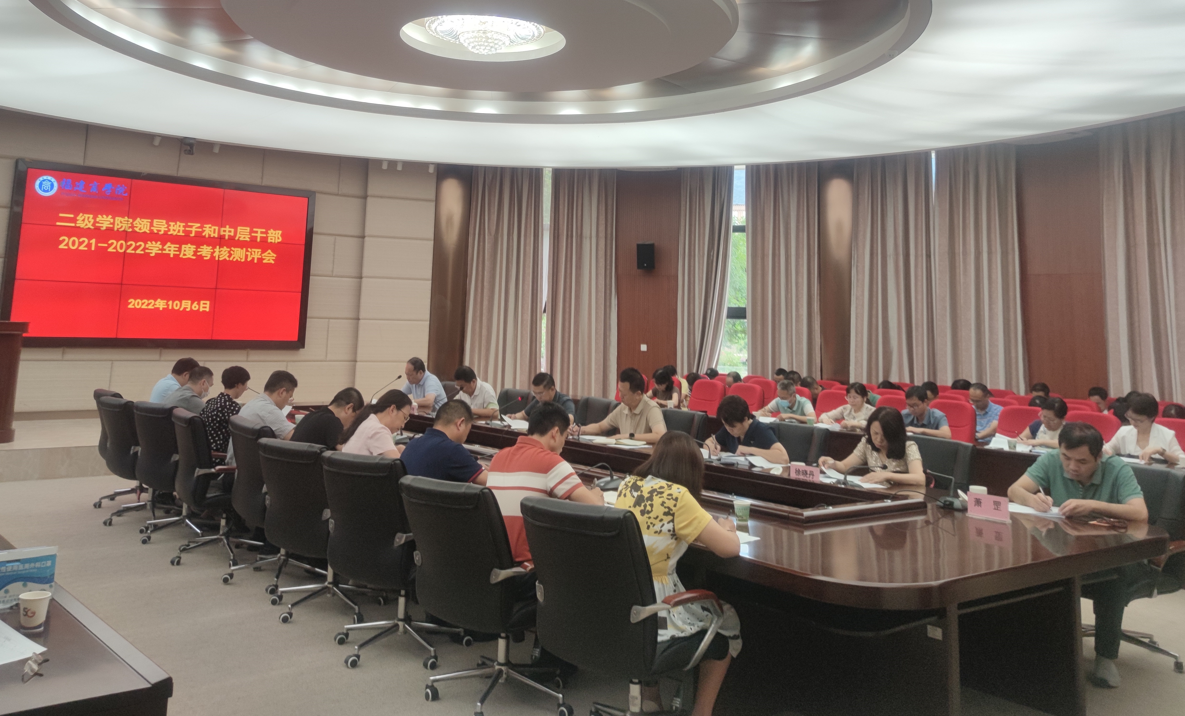 10月6日下午,金年会召开2021-2022学年度二级学院领导班子和中层干部考核测评会。在家校领导刘剑津、程灵、吴访益、徐晓丹、杨晓翔、萧罡、周训胜和全体中层干部参加会议。会议由校党委副书记吴访益主持。