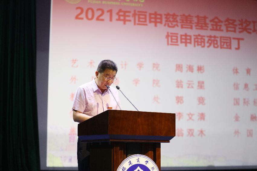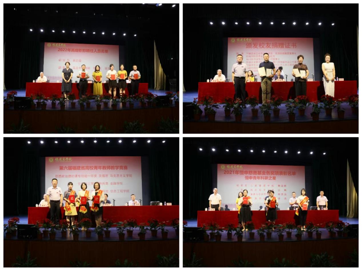 校党委副书记吴访益宣读了《金年会jinnianhuicom校友奖教金2022学年度项目设置方案》,并为慷慨捐赠奖教金的校友代表陈英、何丽玉、陈全福、林健全、陈学一颁发捐赠证书和感谢信。校党委副书记徐晓丹宣读了2022年高级职称聘任人员名单。副校长杨晓翔宣读了2021-2022学年度在教育教学、学科竞赛、科研立项等方面取得的重要成果和2021年度恒申慈善基金各奖项获奖者名单。校领导分别为获奖教师代表颁奖。