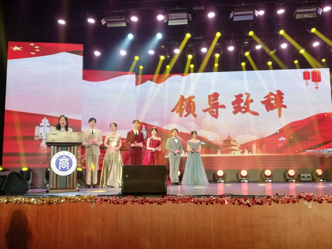 徐晓丹代表校党委致辞。她表示,本届校园文化艺术节恰逢党的二十大召开之年和中国共青团成立100周年,艺术节紧扣“青春献礼二十大,强国有我新征程”主题,为全校师生奉上了一场场精彩的文化盛宴。活动历时一个月,共设置110多个奖项,7500多名师生参与其中,不仅激发了广大青年学生爱党爱国热情,也展示了学校的美育教育成果。徐晓丹在毕业晚会上祝愿毕业生扬帆起航,前程似锦,早传佳音,希望他们常回母校看看!