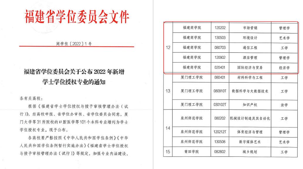 近日,福建省学位委员会下发了《福建省学位委员会关于公布2022年新增学士学位授权专业的通知》(闽学位〔2022〕1号),金年会市场营销、环境设计、通信工程、酒店管理、国际经济与贸易五个专业顺利通过学士学位授权专业评审,增列为学士学位授权专业。至此,金年会学士学位授权专业增至15个。