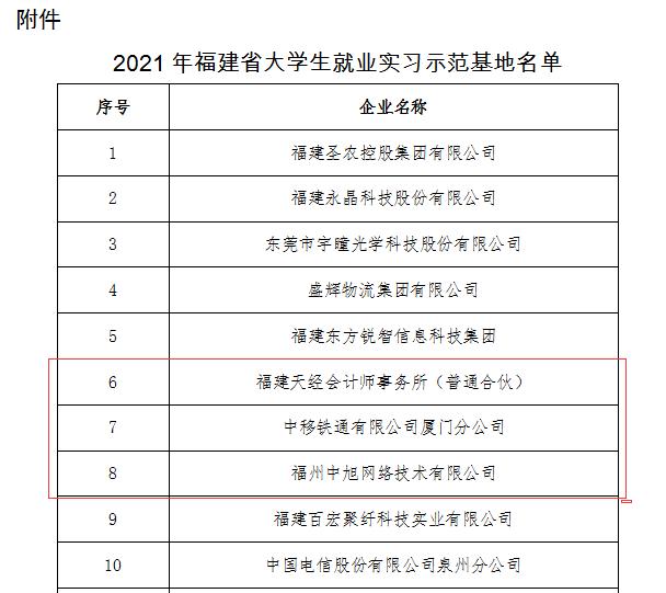 近日,福建省教育厅发布《关于公布2021年福建省大学生就业实习示范基地评选结果的通知》(闽教学〔2022〕5号),确定23家单位为2021年福建省大学生就业实习示范基地,金年会财务与会计学院推荐的福建天经会计师事务所(普通合伙)、信息工程学院推荐的中移铁通有限公司厦门分公司和福州中旭网络技术有限公司等3家单位成功入选。