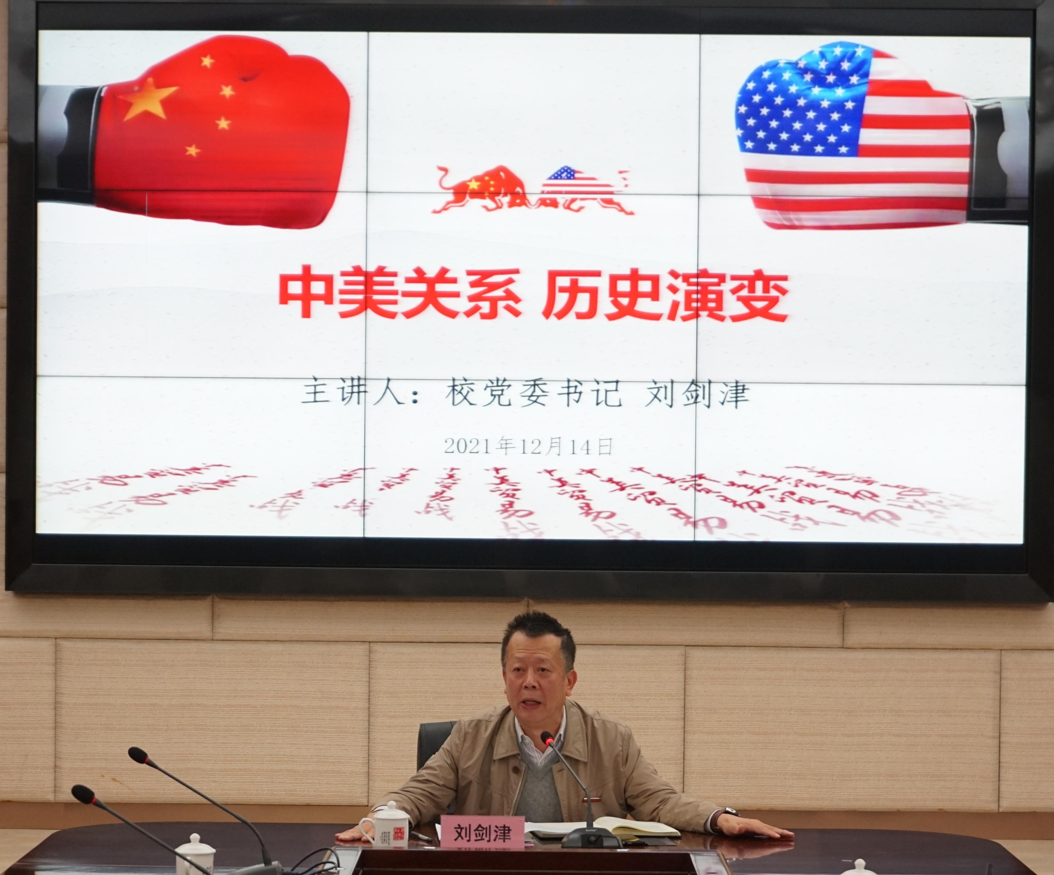 开班仪式结束后,刘剑津为全体学员作题为《中美关系 历史演变》的专题讲座。中国和美国作为当今世界两大经济体,两国关系一直备受关注。刘剑津从中美关系的支持期、敌对期、缓和期、交往期、对抗期五个历史时期系统详实地讲述了中美交往中的历史事件。他指出,纵观中美两国90年的外交关系,发展道路坎坷,通过分析中美关系发展的复杂性,给予我们的启示是新时期中美相处应该坚持相互尊重、和平共处、合作共赢三个原则。只有走相互尊重、求同存异的合作发展道路,才能为中美两国和两国人民,为世界人民带来持久和平和共同繁荣。刘剑津希望同学们要加强学习,积极了解国际形势,全面提升政治素养,增强爱国主义情怀,更好地担当起新时代的责任与使命。