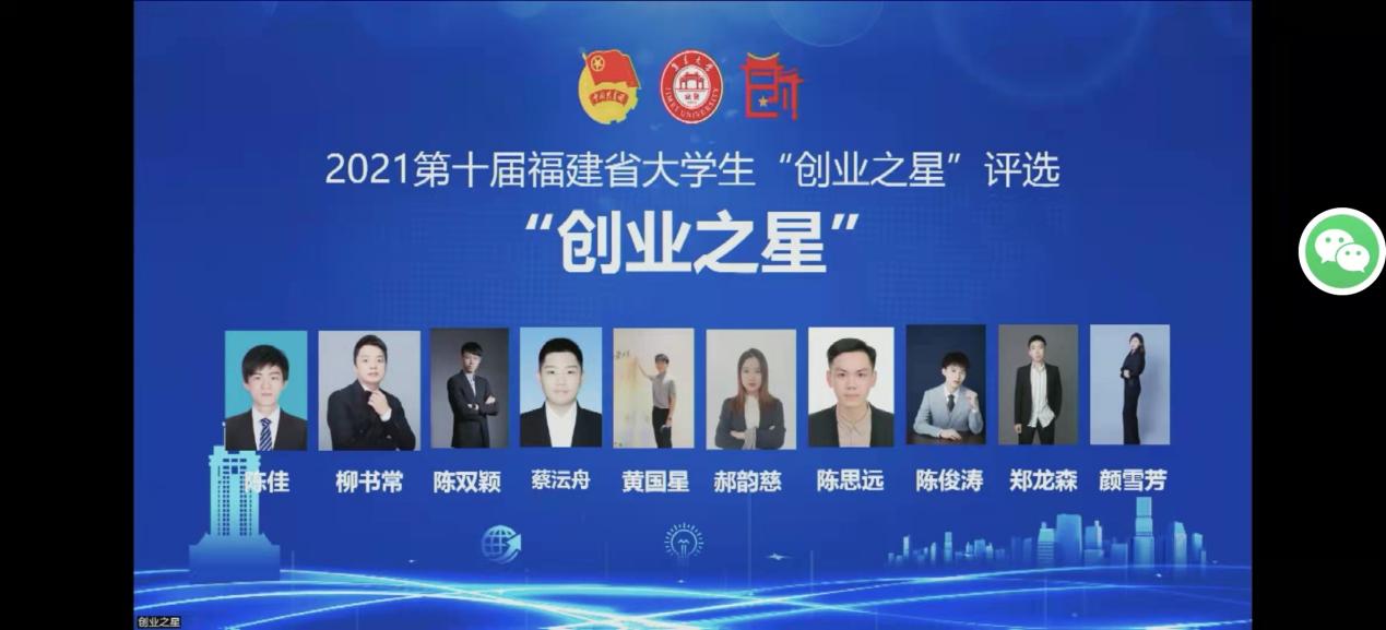 近日,由共青团福建省委、福建省教育厅、福建省人力资源和社会保障厅、福建省文化和旅游厅、福建省科学技术协会、福建省学生联合会联合主办,集美大学承办的第十届福建省大学生“创业之星”评选决赛完成全部赛程,金年会学子陈思远获得“创业之星”荣誉称号,其参赛项目为“美亚——新时代乡村旅游服务商”(指导老师:翁双木、吴芹瑶、廖维阳、缪晓斌),取得了金年会在该项赛事上零的突破。