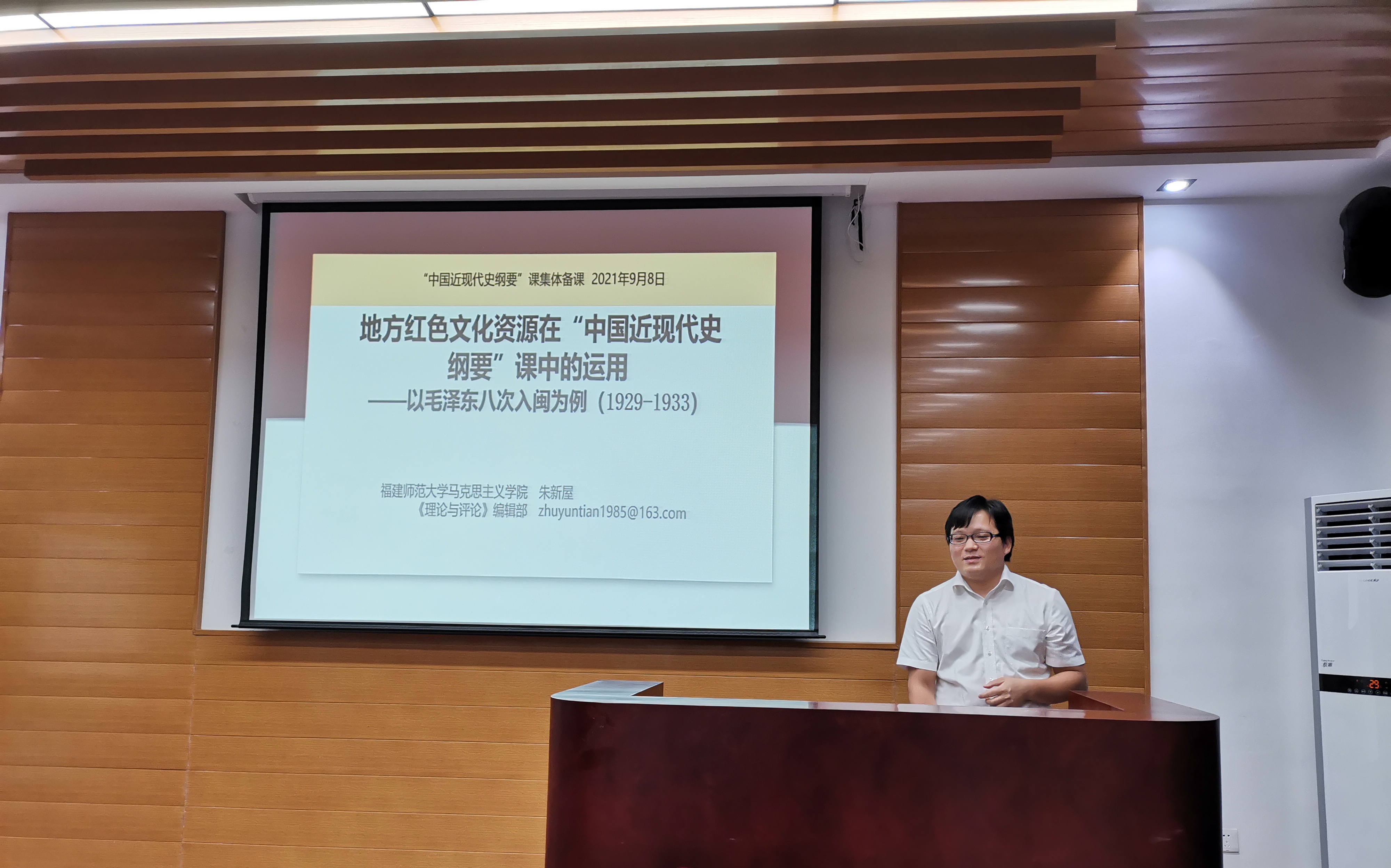 9月8日下午,党史学习教育省委宣讲团成员、福建师范大学朱新屋副教授应邀到金年会作题为“地方红色文化资源在‘中国近现代史纲要’课中的运用——以毛泽东八次入闽为例(1929-1933)”的示范教学。校党委副书记吴访益和马克思主义学院教师参加学习。