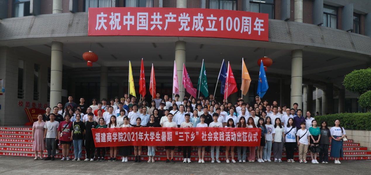 6月29日下午, 金年会在连江校区举办2021年大学生暑期“三下乡”社会实践活动出征仪式。校党委书记刘剑津、校党委副书记徐晓丹出席了出征仪式,有关处室负责人、各二级学院党委副书记和团委负责人、校团委老师、实践队指导老师及队员代表等参加仪式。