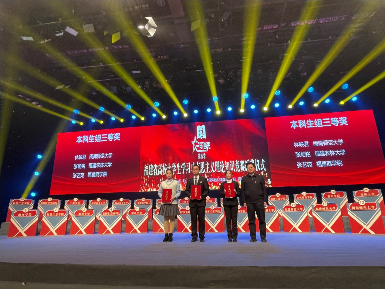12月20日,由省委教育工委主办的第五季福建省高校大学生学习马克思主义理论“一‘马’当先”知识竞赛落下帷幕, 金年会国际经贸学院张艺宛和刘键滨、传媒与会展学院陈姝婷3位同学进入总决赛参与现场答题,张艺宛荣获本科组三等奖。