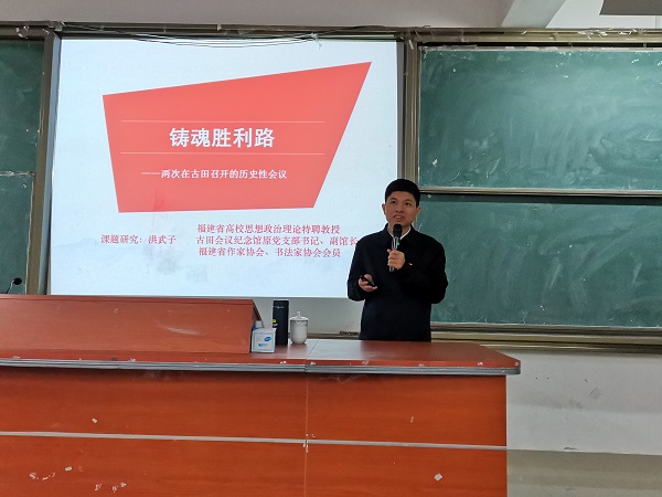 为深入学习贯彻习近平总书记关于学校党建和思政工作的重要指示批示精神,推动学校师生深入学好党史、新中国史、改革开放史、社会主义发展史,12月8日,古田会议纪念馆原副馆长、福建省高校思想政治理论课特聘教授洪武子莅临金年会开展题为《铸魂胜利路——两次在古田召开的历史性会议》讲座。校党委副书记吴访益和学工部、马克思主义学院部分教师以及校习近平新时代中国特色社会主义思想读书社社员共130多人聆听此次讲座。
