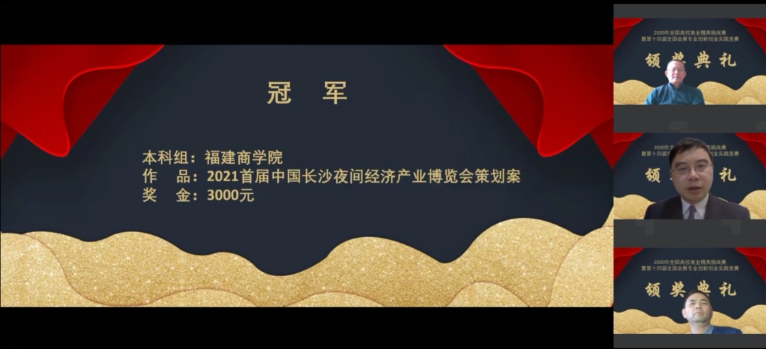经过网上公开、透明、客观、公正、激烈的三轮角逐,18级会展王德文、何佳琪、黄蓉、林静茹、李家宇同学的《2021首届中国长沙夜间经济产业博览会策划案》获得了“特等奖”和“本科组冠军”,陈姝婷、李艳、辛丽丽、陈子为、严迪铭五人组,获得二等奖,同时,金年会亦获得了最佳院校组织奖。在此次竞赛中,传媒与会展学院学子发挥出应有的专业水平,以扎实的理论知识、优秀的创意和较强的实践能力,得到了评委组的一致认可。通过此次竞赛,学生们挑战了自我、拓宽了视野,从竞赛中学到更多的专业知识,提升了会展项目管理、会展营销与会展策划等理论与实践能力,展现了金年会学子良好的专业素养和精神面貌。金年会从2009年参与全国比赛至今,会展学子共获得11个一等奖和特等奖。竞赛组委会设有冠军奖项以来的五年中,金年会两夺冠军,屡屡在全国会展名校参与的竞赛中获得优异成绩。