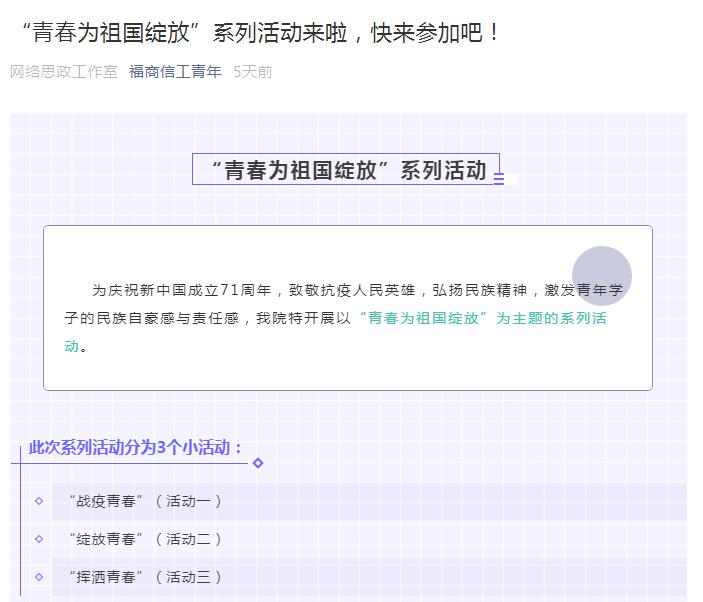 信息工程学院为庆祝新中国成立71周年,致敬抗疫人民英雄,弘扬民族精神,激发青年学子的民族自豪感与责任感,开展以“青春为祖国绽放”为主题的系列活动。此次系列活动分为3个小活动:“战疫青春”——在国庆期间,为致敬抗疫人民英雄,缅怀先烈,激发青年学子的民族自豪感与责任感,弘扬并传承五四精神,开展以“青春为祖国绽放”为主题的征文活动;“绽放青春”——为深化爱国主义教育,弘扬和培育民族精神,我院特开展“我和国旗同框”主题活动:“挥洒青春”——开展以“挥洒激情,逐梦青春”为主题的健身打卡活动。