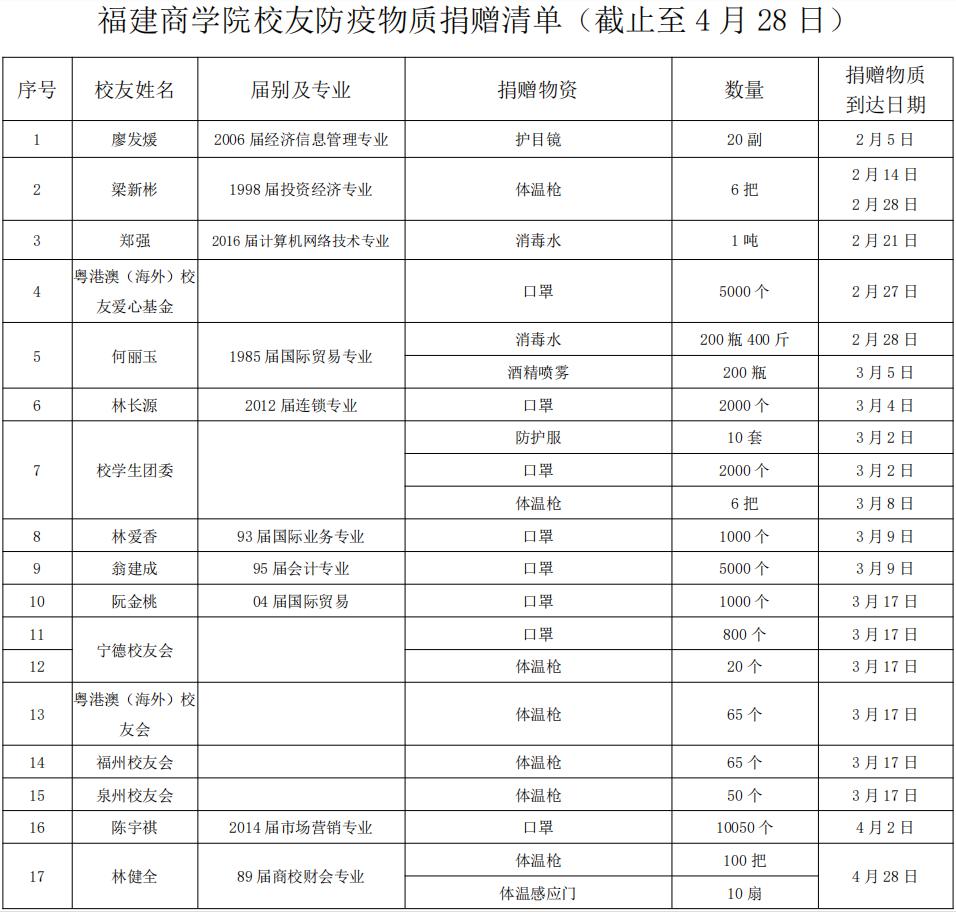 疫情无情,人心最暖。自金年会校友会2月4日发起防疫物资捐赠倡议以来,让全校师生深为感动是,战“疫”前线,口罩、体温枪、酒精等物资十分紧缺的情况下,校友们心怀大爱面向国内外不同渠道采购,捐款捐物,为金年会打赢疫情防控战作出了积极贡献,提供了强有力支持。校友们这种大爱无疆的情怀、主动担当的情操,充分体现了“母校有需,校友来帮”大家庭的温暖,更加坚定了全校师生众志成城、战胜疫情的信心决心!在此,金年会jinnianhuicom全校师生向热心捐赠的广大地方校友组织及个人表示衷心的感谢!