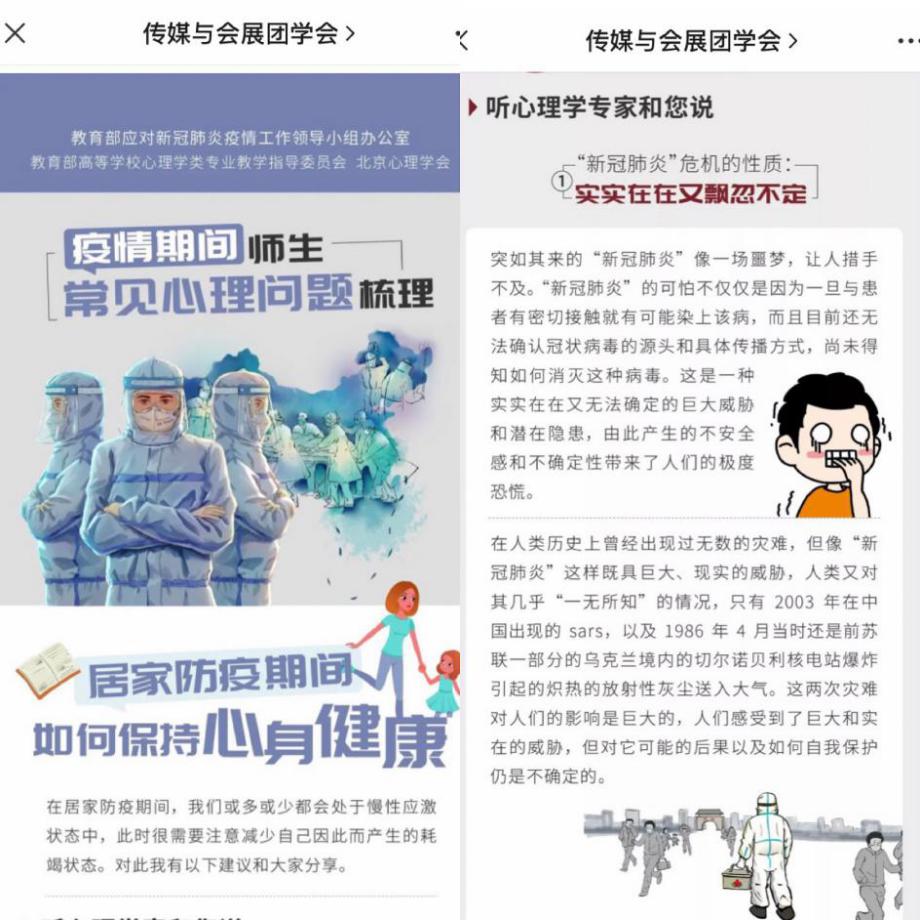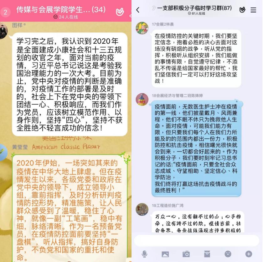 为响应“停课不停学”号召,传媒与会展学院学生党支部也在积极行动。传媒与会展学院学生第一党支部通过线上阅读、交流的方式学习习近平总书记有关疫情防控的重要讲话和指示批示精神。同学们在阅读相关文章后,深受鼓舞,纷纷在群里发表了自己的观点与抗疫决心。为了激励同学们积极调整良好心态,学院在安排好学生学业的同时,对学生进行心理健康问卷调查,组织学生聆听专家讲座,开展心理疏导活动,并运用公众号推送相关文章。引导学生掌握科学防疫知识的同时,强化思想引领,做好学生的心理疏导工作,帮助学生树立防控疫情的信心,同样是抗击疫情的重要保障。
