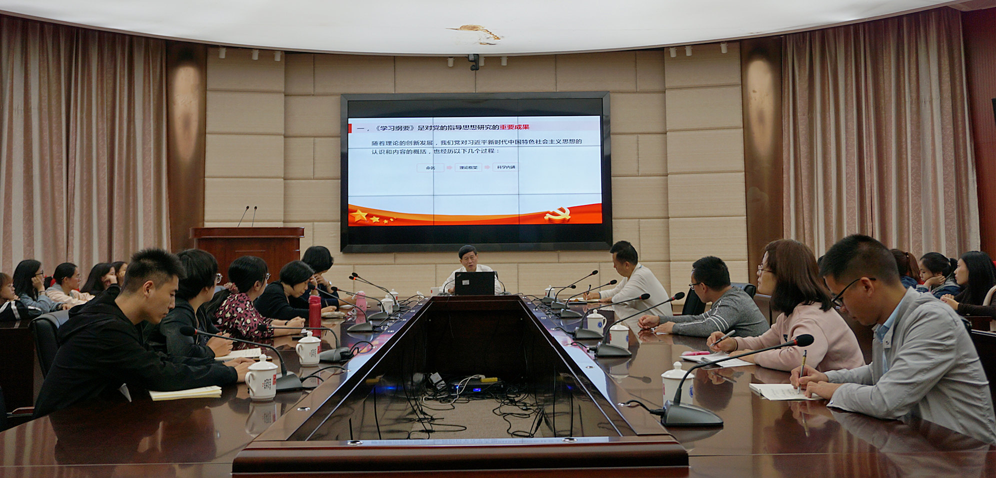 郑传芳教授从“坚持党对一切工作的领导”“全面从严治党纳入战略布局”“新时代党的建设总体布局”以及“党的理论宝库增添新的指导思想”等方面详细阐述了作为党的指导思想研究重要成果的《学习纲要》的重要性;在讲授中,郑教授系统梳理了《学习纲要》的基本框架,并从“权威性”“系统性”“辅读性”三个角度分析了《学习纲要》的特点,从“历史方位”“根本方向”“总体布局”“国家安全观”“政治保证和能力建设”等几个方面向师生解读了《学习纲要》的基本内容。