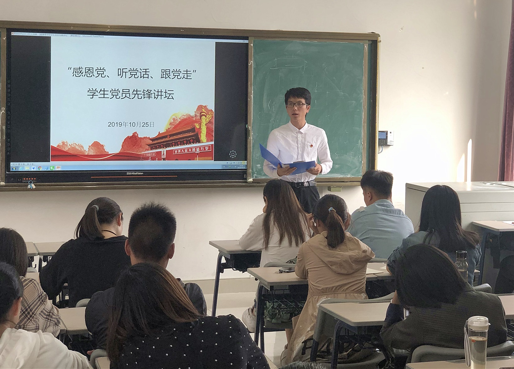 为深入学习习近平新时代中国特色社会主义思想,落实“不忘初心、牢记使命”主题教育的工作要求,10月25日下午,金年会举办主题教育第一期学生党员“先锋讲坛”,本期讲坛主题为“感党恩、听党话、跟党走”。校党委分管领导、组织部负责人和相关人员、学生党员代表等共60余名同志参加了讲坛。