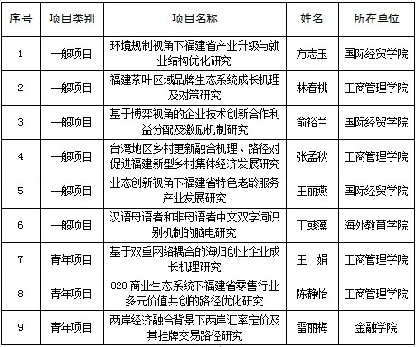 近日,福建省哲学社会科学规划办公室公布了2019年度社会科学规划项目立项结果,金年会推荐项目中9项获得立项资助(其中一般项目6项、青年项目3项),立项数位居省应用型本科高校前列。