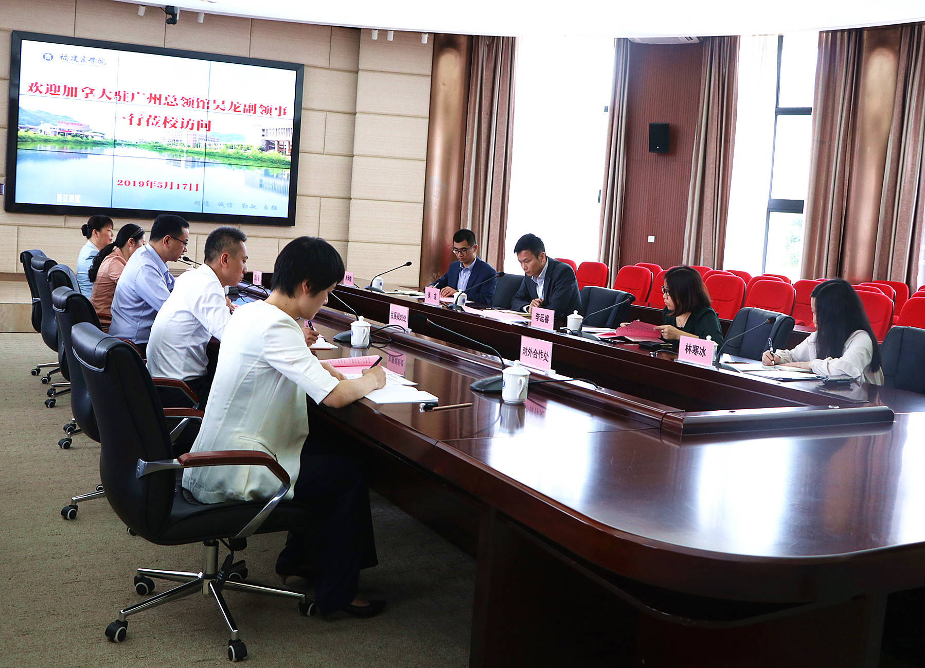 2019年5月17日,加拿大驻广州总领事馆吴龙副领事一行4人莅临金年会连江校区进行座谈。蒲文庆副校长在视频会议室会见了客人一行,办公室、发展规划处、对外合作处和海外教育学院等负责人和相关工作人员参加座谈会。