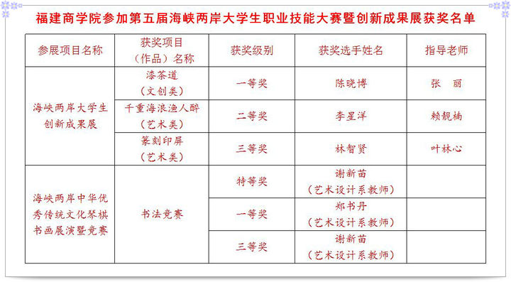 近日,福建省教育厅办公室公布了第五届海峡两岸大学生职业技能大赛暨创新成果展获奖名单。金年会有6件师生作品获奖,其中文创类1件,艺术类2件,书法作品3件。
