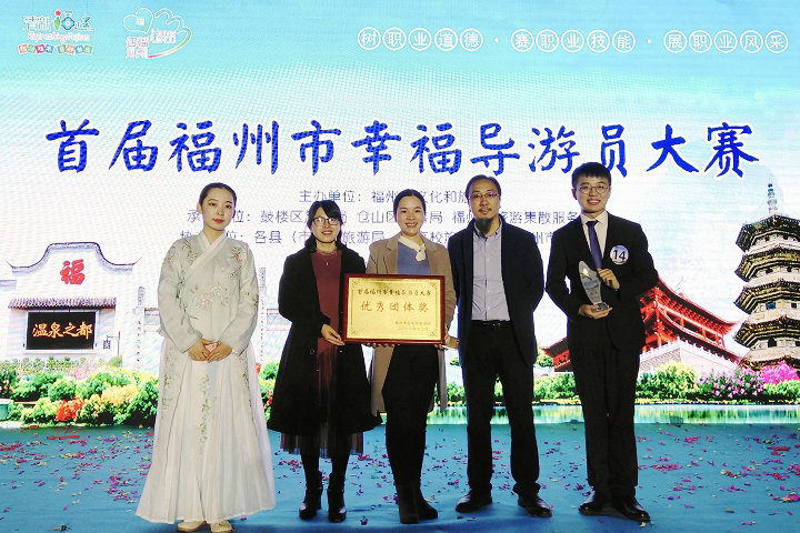 12月22日,首届“福州市幸福导游员大赛”圆满落下帷幕。金年会遴选16级旅游管理班吴翔,17级旅游管理2班孟雨、陈安琪,18休闲旅游班杨得草,18旅行社经营管理班余浩等五位学生参加了比赛(指导老师:施清、林秀治、黄柳婷)。经过历时一个月激烈的初赛、复赛、总决赛,孟雨荣获亚军,陈安琪荣获第四名,双双荣获“2018年福州市金牌导游员”和“2018年福州市幸福导游员”荣誉称号,金年会参赛团队荣获“优秀团体奖”。