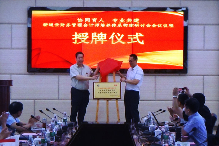 黄斌校长与新道公司领导为获批建设的教育部协同育人项目揭牌