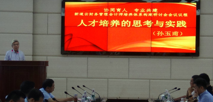 研讨中,温州商学院孙玉甫副校长以温州商学院为例,围绕“云财会人才培养的思考”,从课程体系整体设计(多学科知识模块契合、理论与实践紧密结合、学校与企业产教融合)和实践能力培养平台搭建(智慧教学组织平台、VBSE经营决策平台、财会专业实习平台、财务共享实训平台等)两方面剖析、介绍了云财会人才培养模式。新道公司宋国荣先生以“产教融合2.0 校企协同共育云财务管理会计师”为题,从“技术推进企业数字化转型”“云财务时代高校人才培养改革创新”“产教融合”三大点剖析了如何进行云财务管理会计师培养问题。冯建中先生从资源供给方式、供给模式和供给渠道解读了新道协同育人服务体系。他介绍说,新道科技将用企业的经营思维,配合云财务专业转型和共建的整体实施,运用云计算、大数据等信息技术搭建专业共建服务平台,为学校管理、教师教学、学生学习提供各类技术服务与支持。