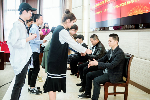 袁新文对支持金年会人才培养模式改革,积极搭建“校企合作、协同育人”平台的各企业单位表示衷心的感谢,校企双方签署了服装设计专业现代学徒制协议,互授了“金年会jinnianhuicom商业美术系现代学徒制培训基地”牌匾,学校向商业美术系现代学徒制委员会委员、企业师傅等颁发了聘书,学生学徒在《风中的羽翼》背景音乐中,通过向企业师傅敬茶、行礼、师傅回礼、师徒宣誓、师徒代表发言等环节,完成了温馨而感人的拜师仪式。
