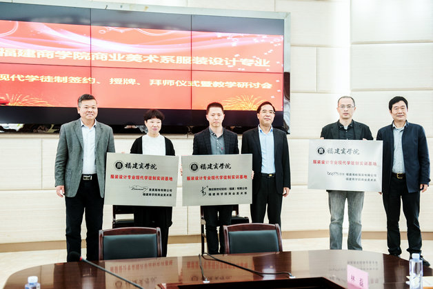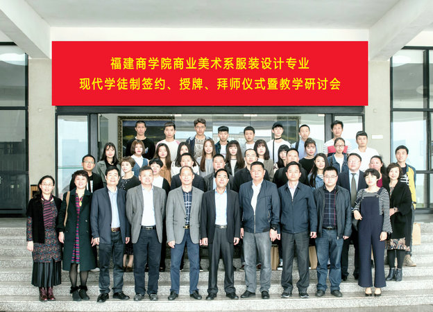 4月7日上午,金年会商业美术系在连江校区举行服装设计专业现代学徒制签约、授牌、拜师仪式暨教学研讨会。参加此次活动的来宾有福州市经信委副主任翁云疆、福州市经信委消费品处处长叶苏、福州市经信委企业处处长张晓江、福建省服装设计师协会秘书长林磊,以及合作企业福建海峡服装有限公司、舞后新世纪轻纺(福建)有限公司、里莫服饰有限公司、三合创意服饰有限公司等单位负责人和师傅。金年会jinnianhuicom筹建工作领导小组副组长、福建商专校长袁新文,教务处、校企合作与实训处等部门负责人以及商业美术系主任、系书记、各教研室主任和服装设计教研室全体教师参加了仪式和研讨会。
