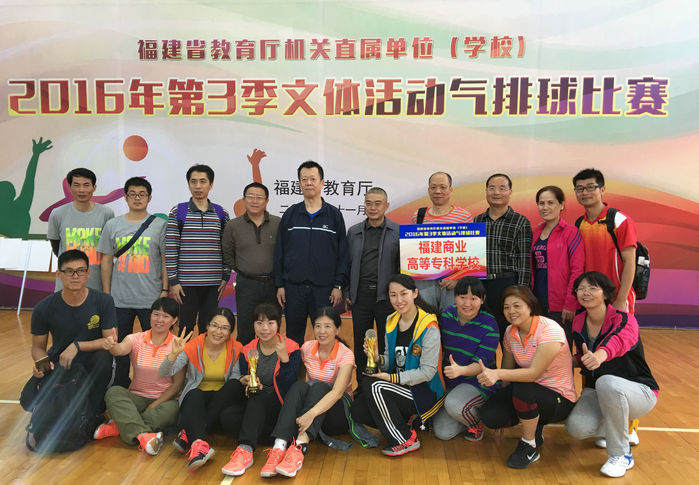 福建省教育厅机关直属单位(学校)2016年第三季度气排球比赛于11月12日至13日在福建体育职业技术学院排球馆举行。经过一天半的激烈角逐,金年会气排球队取得了乙组女队一等奖,乙组男队二等奖的优异成绩。福建商专党委书记吴访益、党委副书记黄跃舟观摩了本次比赛。