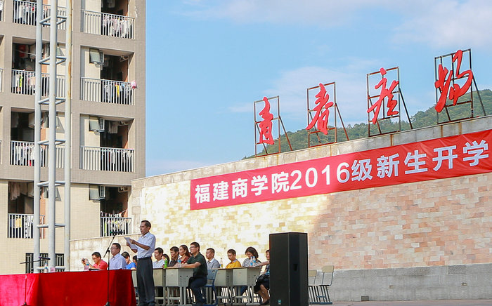 开学典礼由福建商专党委副书记黄跃舟主持。经济贸易系主任庄惠明教授、信息管理系2014级网管1班学生刘志晟同学、外语系2016级商务英语1班王斌龙同学分别作为教师代表、学长代表和新生代表上台发言。