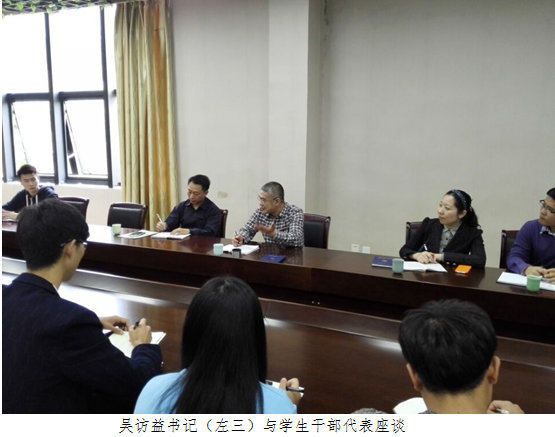 11月25日上午,校学生干部代表座谈会在新校区会议室召开。校党委书记吴访益出席座谈会,党委工作部、校团委、经贸系等负责同志参加了座谈。 参加座谈会的学生干部代表来自校团委各部门、校学生会、校社团联合会、校浪舟文学社等。座谈会上,大家围绕学风建设、校园文化建设、社团管理、班级管理等方面畅所欲言,讲读书、谈进步,说体会,话成长,吴书记对学生谈及的学习、生活和工作情况进行了深入细致的了解,并在平等交流中作了具体指导。 吴书记对同学们勤奋学习的劲头、创新实践的热情、诚实做人的品德等表示欣慰和赞许,同时对同学们提出四点希望:一是要充分认识读书对成长的重要性。中国教育学会会长朱永新说过:一个国家谁在看书,看哪些书,从某种意义上决定了这个国家的未来。中国人民大学党委书记靳诺也说:读书不仅仅影响到个人,还影响到民族,影响到国家和社会。商专的同学们要养成读书的习惯,要尽到读书这个本分,让读书不仅成为学习的一种方式,更成为生命中不可或缺的一部分。二是要设定正确的人生目标,始终朝着目标努力,在掌握知识、探索真理的路上不断前行。三是学生干部要加强锻炼提高自身的组织能力、交际能力与团队协作能力。学生干部是教师和学生之间的桥梁与纽带,是学校各项工作顺利开展的得力助手。学生干部要做好本职工作,组织开展好一些频度适当、有益身心的文体活动,团结和带领周围的同学们珍惜大学美好时光,保持朝气蓬勃、奋发向上的精神状态。四是注重学习成绩的提高。作为学生,第一重要的是搞好学习,要以自己所学的专业知识和技能本领,回报老师、回馈社会,更好地报效祖国、报答父母。吴访益书记还要求学校各系(部)负责人和老师们要多和同学们在一起谈心、聊天,了解他们的思想动态,重视他们的身心健康,关注他们的成长进步,培养师生之间深厚的感情。 座谈会结束后,吴访益书记还参观了浪舟文学社办公场所,并赠送给浪舟文学社《莫言作品全集》一套,勉励同学让读书成为一种习惯。 在座的学生干部认真聆听吴访益书记提出的四点希望