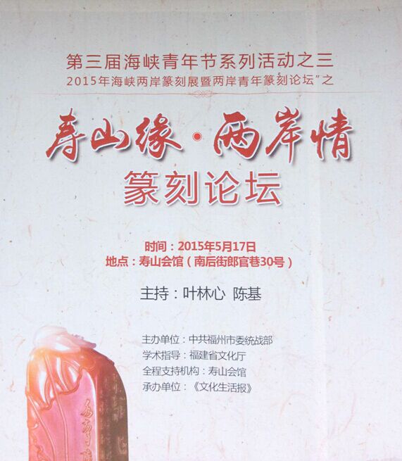 5月17日,由福建省文化厅学术指导、中共福州市委统战部主办的“寿山缘·两岸情”篆刻论坛,在南后街寿山会馆隆重举行。省文化厅副厅长陈吉、中国工艺美术大师林飞、寿山国石文化研究会秘书长陈基以及来自台湾的青年篆刻家代表吕妮桦和罗淑娇和青年篆刻爱好者代表共近百人参加了活动。