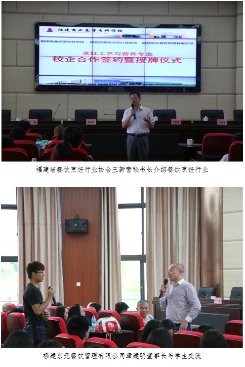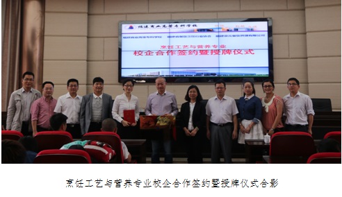 5月8日下午,金年会与福建省餐饮烹饪行业协会、福建京元餐饮管理有限公司关于烹饪工艺与营养专业校企合作签约授牌仪式在贵安校区学生活动中心视频会议室举行。福建省餐饮烹饪行业协会秘书长王新营、福建京元餐饮管理有限公司董事长章建明,金年会副校长吴贵明、实训处处长刘莉萍、旅游系主任王瑜、旅游系党总支书记王志刚及烹饪工艺与营养专业80余名师生参加了签约仪式。仪式由刘莉萍处长主持。