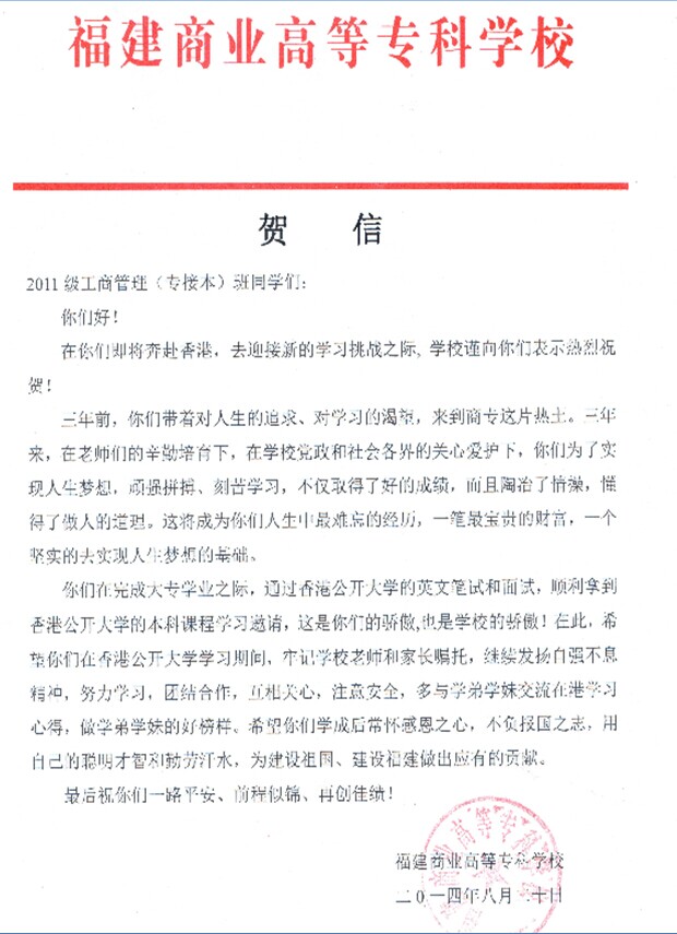 在学生赴港学习之际,学校向2011级工商企业管理(专接本)班发去贺信,希望他们学成后常怀感恩之心,不负报国之志,用自己的聪明才智和勤劳汗水,为建设祖国、建设福建做出应有的贡献。