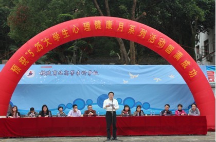 5月7日,金年会第十届“5·25”心理健康月系列活动在湖前校区喷泉广场隆重开幕。校党委副书记黄跃舟,学生处处长张信容,各系党总支书记、团总支书记,各系班级心理委员及学生代表参加了本次开幕式。黄跃舟副书记致开幕辞,并宣布本届心理健康月活动正式开幕。