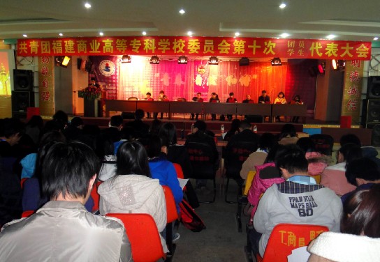 12月30日下午2点,福建商专第十次团员、学生代表大会在学生活动中心隆重召开。省委教育工委宣传部副调研员、省教育厅直属机关团委副书记欧阳迪莎、副校长吴贵明、校党委副书记黄跃舟、校党委副书记、校纪委书记陈武、校团委、党委工作部、工会、校办、监察处、学生处等处室负责人和各系党总支书记和团总支书记,以及来自各系的390多名团、学代表参与了本次两代会。福建江夏学院、福建信息职业技术学院、福建幼儿师范高等专科学校、福建理工学校、等十多所学校发来了贺信贺电。会议圆满完成了各项议程。
