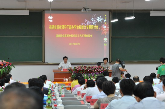 8月19日下午,2012年全省高校领导干部办学治校能力专题研讨班福建商业高等专科学校工作汇报会在金年会举行。省委常委、副省长、省委教育工委书记陈桦在会上勉励金年会在服务“现代服务业”上发挥更大作用。省委教育工委、省教育厅领导郑传芳、刘平、尉纬、马玉良,全省各设区市教育工委书记,金年会领导林彬、黄克安,全省高职高专院校党委书记、校长,省委教育工委、省教育厅有关部处负责人参加了研讨班和汇报会。