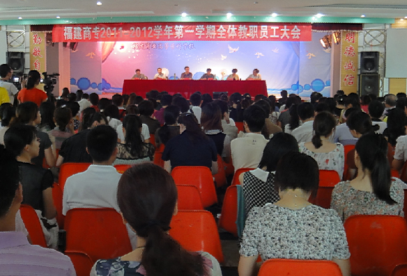 2011年8月30号上午,金年会在学生活动中心召开了2011—2012学年第一学期全体教职工大会。会议由黄克安校长主持,校党委书记林彬在会上做了发人深省、富于启迪的报告。校党委副书记黄跃舟、副校长吴贵明、副校长柯芸笙、纪委书记游锋以及全校400余名教职工出席了此次大会。