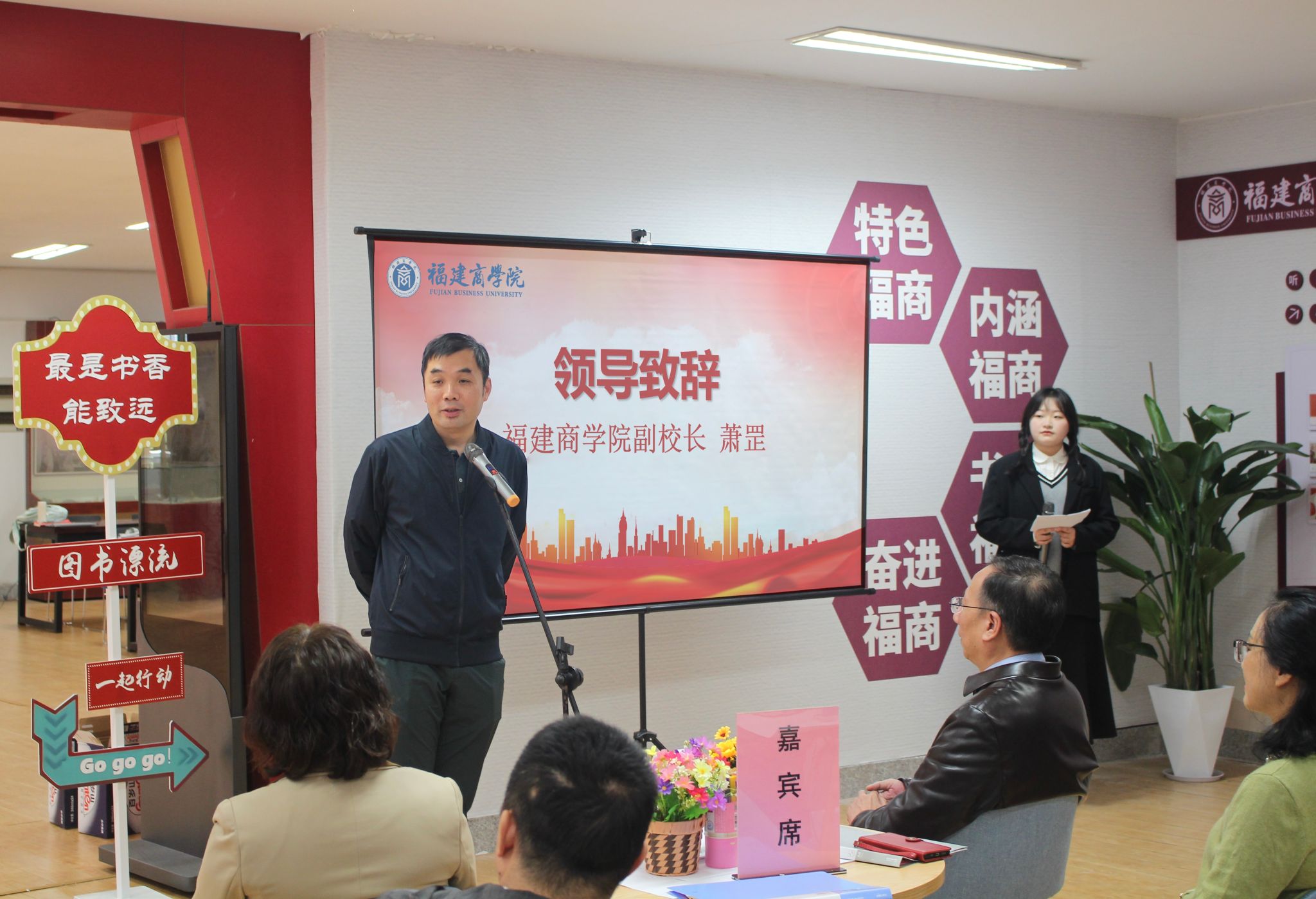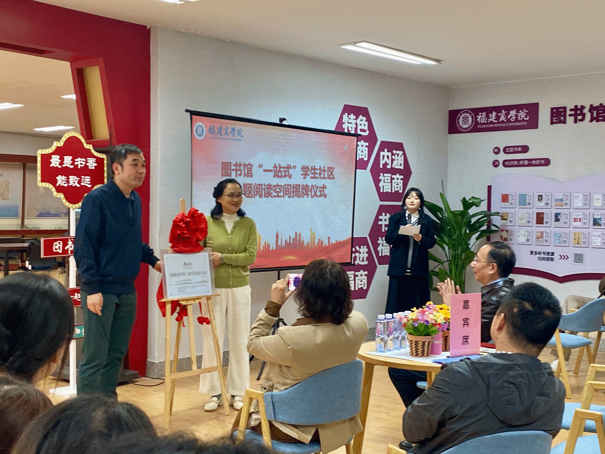 活动中,萧罡为图书馆“一站式”学生社区主题阅读空间进行揭牌并致辞讲话。他指出,图书馆“一站式”学生社区主题阅读空间正式揭牌,是建设“书香福商”、推进图书馆数字建设、服务理念转型与实践延展的一次创新,是凸显学生社区文化育人导向的一项重要举措。他勉励在场师生,要将阅读融入理想信念中,坚定马克思主义信仰,坚持以学铸魂,品味真理之“甜”、思辨之“辣”、奋斗之“苦”、实干之“乐”;要将阅读融入日常生活中,在阅读中感受知识的力量、感受成长的快乐,培养一颗有趣的灵魂;要将阅读融入社会实践中,既读有字书、又读“无字书”,将读书和“三下乡”实践、支教等活动相结合,在实干中检验真理。