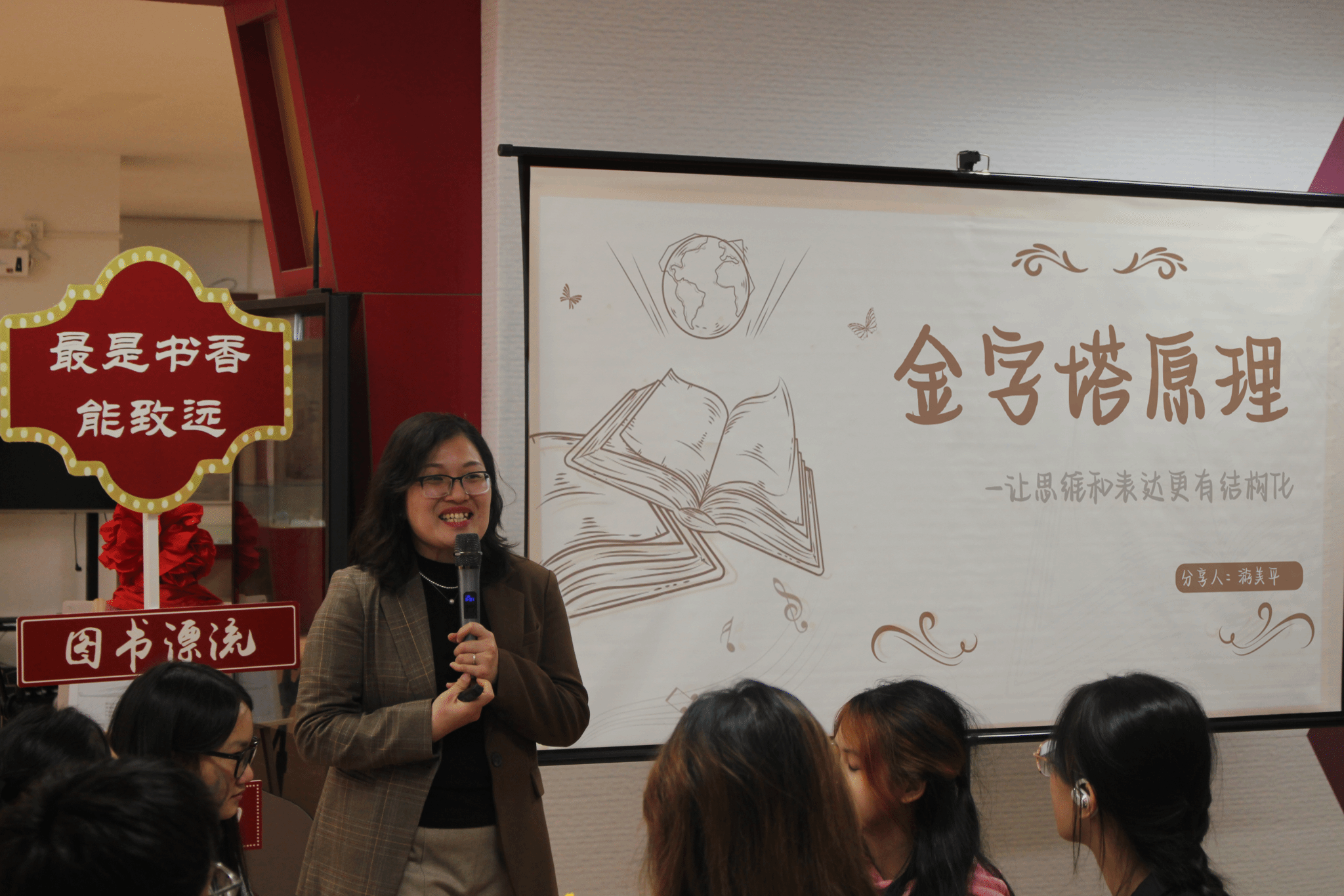 随后,图书馆馆长林琼向与会师生详细介绍了阅读空间的功能与资源,帆书(福州运营中心)游美平老师为大家带来精彩的《金字塔原理》翻转课堂。