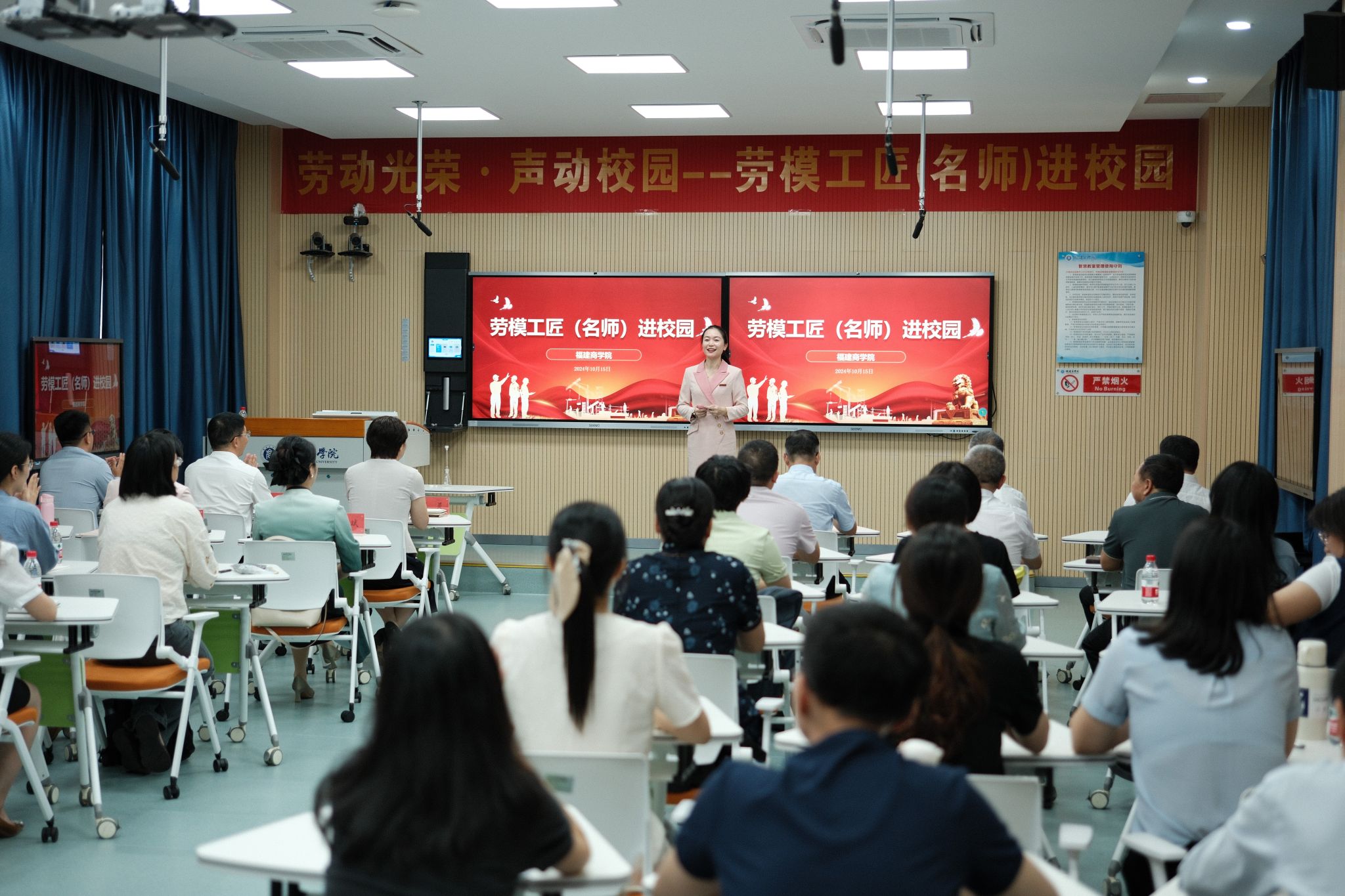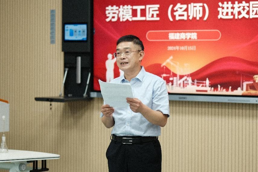 10月15日下午,由福建省总工会主办、金年会承办的2024 年福建省“劳模工匠(名师)进校园”系列活动——劳模工匠(名师)公开课在金年会连江校区举行。省教科文卫体工会工委主任郭立新、省教科文卫体工会工委二级调研员左修坤、省教科文卫体工会工委副主任阳先辉,校领导吴访益、程灵、蒲文庆出席活动,金年会近50名青年教师参加活动。