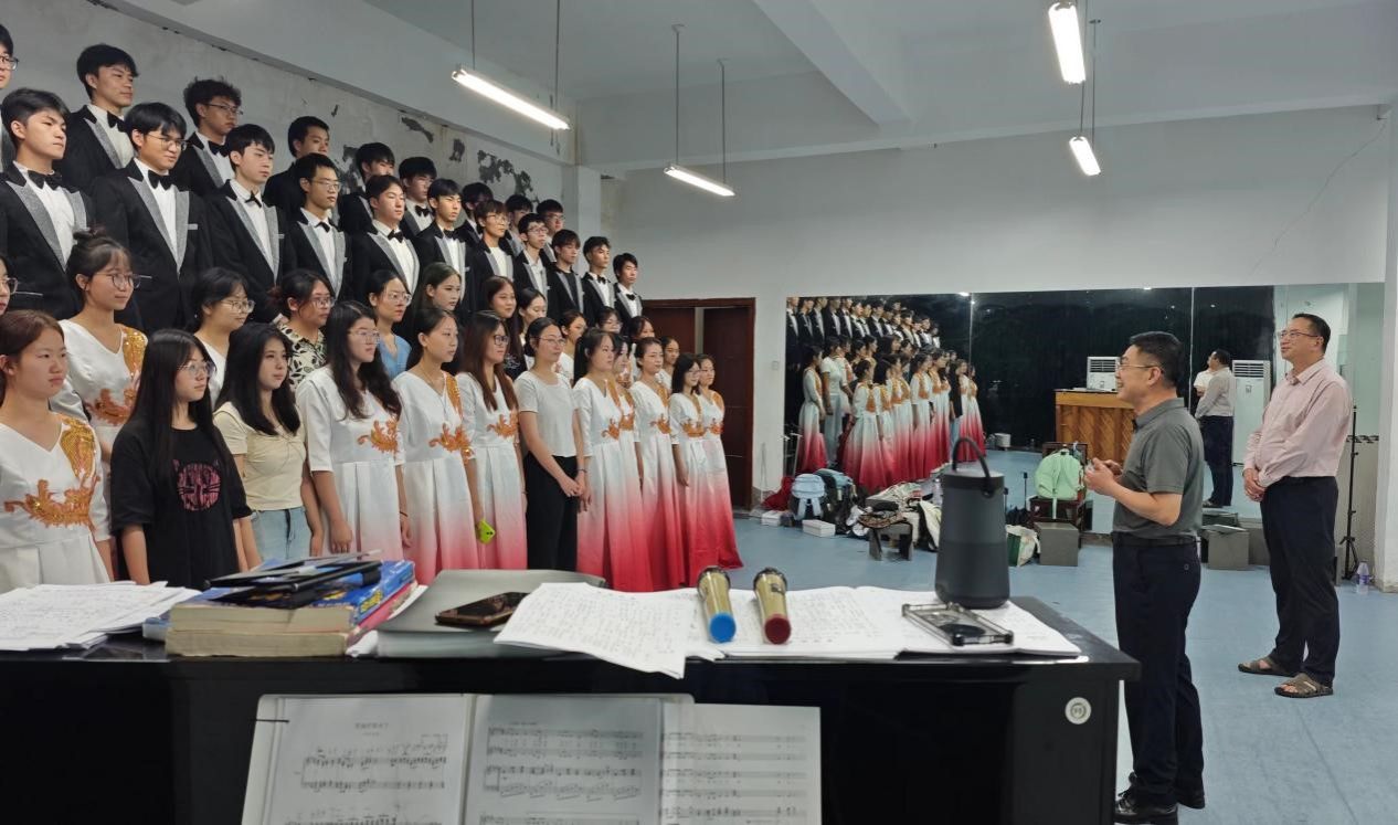 校党委书记吴访益为合唱队员加油鼓气